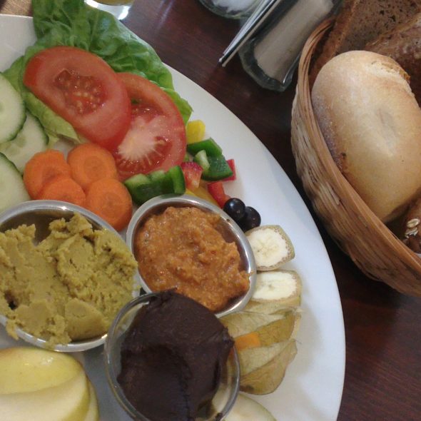 Frühstück mit Brötchen, Obstsalat, Gemüsesticks & 6 süßen und pikanten Brotaufstrichen (Oma Rosa, Dortmund)