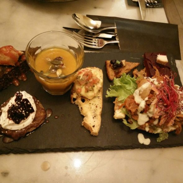 Charleston-Burger mit Fritten, Flammkuchen, Snickers-Mousse (im Schnell Veg, Düsseldorf)