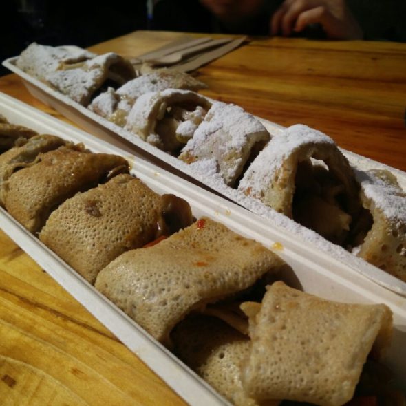 Pancake Stroganoff mit Wodka, Pilzen, Paprika, Zwiebeln, Knoblauch und Petersilie + Pfannkuchen mit Apfel, Rosinen, Zimt, Mandeln und Ahornsirup (The Happy Pig, Amsterdam, Niederlande)