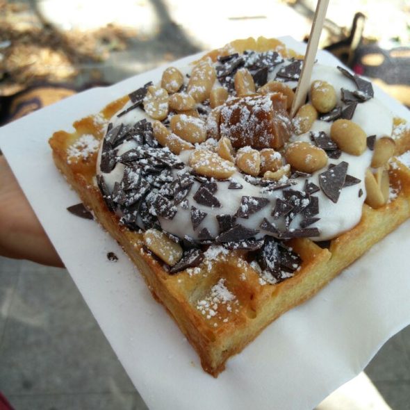 Belgische Waffeln mit veganer Schlagsahne, Schokosplittern, Erdnüssen und Karamellbonbon (Vegan Street Day, Dortmund)