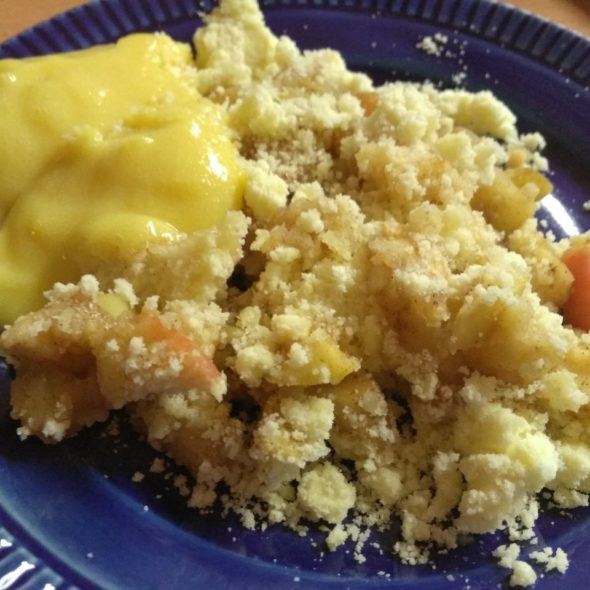 Erbsensuppe mit Croutons, Kürbiscurry, Applecrumble mit Vanillepudding (Eigenbaukombinat, Halle (Saale))