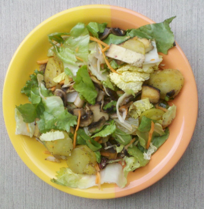 Bratkartoffeln mit gebratenem Räuchertofu, Champignons und gemischtem Salat
