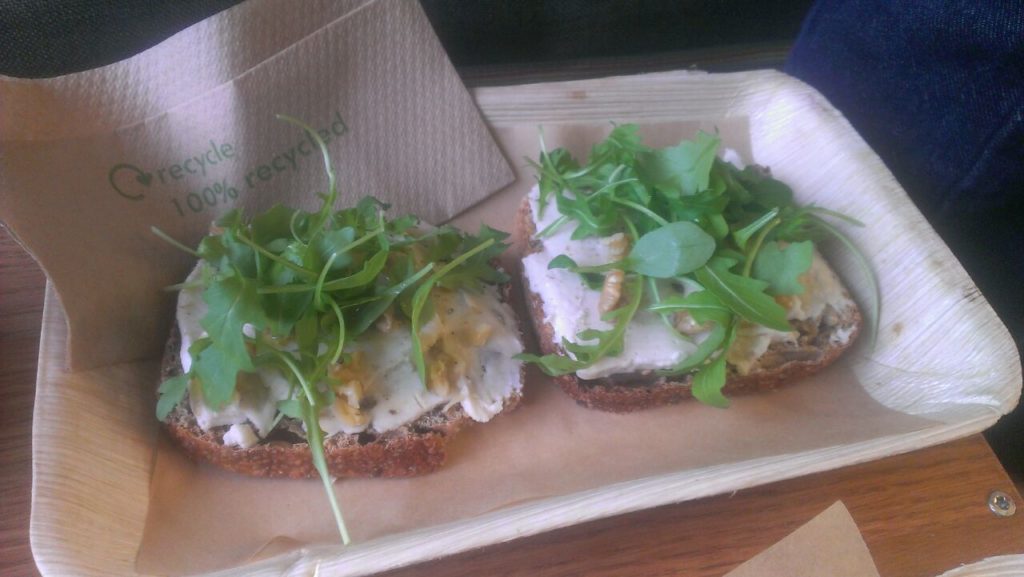 Spelt Sandwich mit veganem Mandelbrie, Feigenmarmelade, Rukola und Walnüssen (Vegabond, Amsterdam, Niederlande)