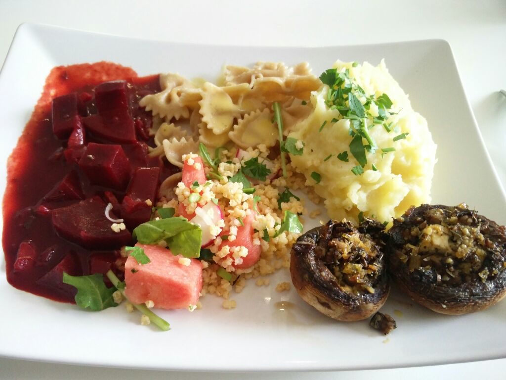 Rote-Bete-Gulasch, Kartoffelpüree, Hirse-Melonen-Salat, gefüllte Champignons, Vollkornschmetterlinge (Leyka, Unna)