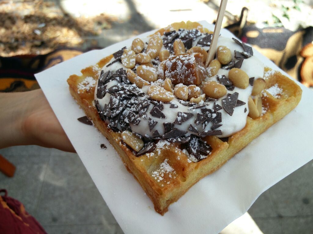 Belgische Waffeln mit veganer Schlagsahne, Schokosplittern, Erdnüssen und Karamellbonbon (Vegan Street Day, Dortmund)