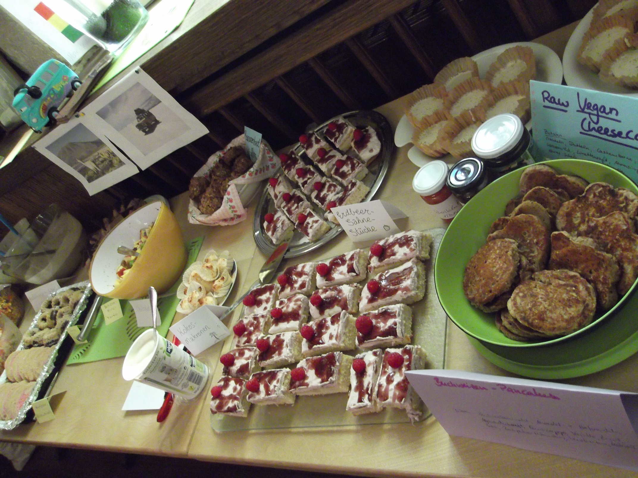 Brot, Cupcakes, Erdnussbutter, Gebäck, Gemüse, Getränke, Himbeeren, Kaffee, Kichererbsen, Kuchen, Möhren, Muffins, Nudeln, Obst, Reis, Salat, Schokolade, Sojamilch, Sojaschlagsahne, Sojayoghurt, Tomaten, Torte, Vanille, veganer Käse, Zimt