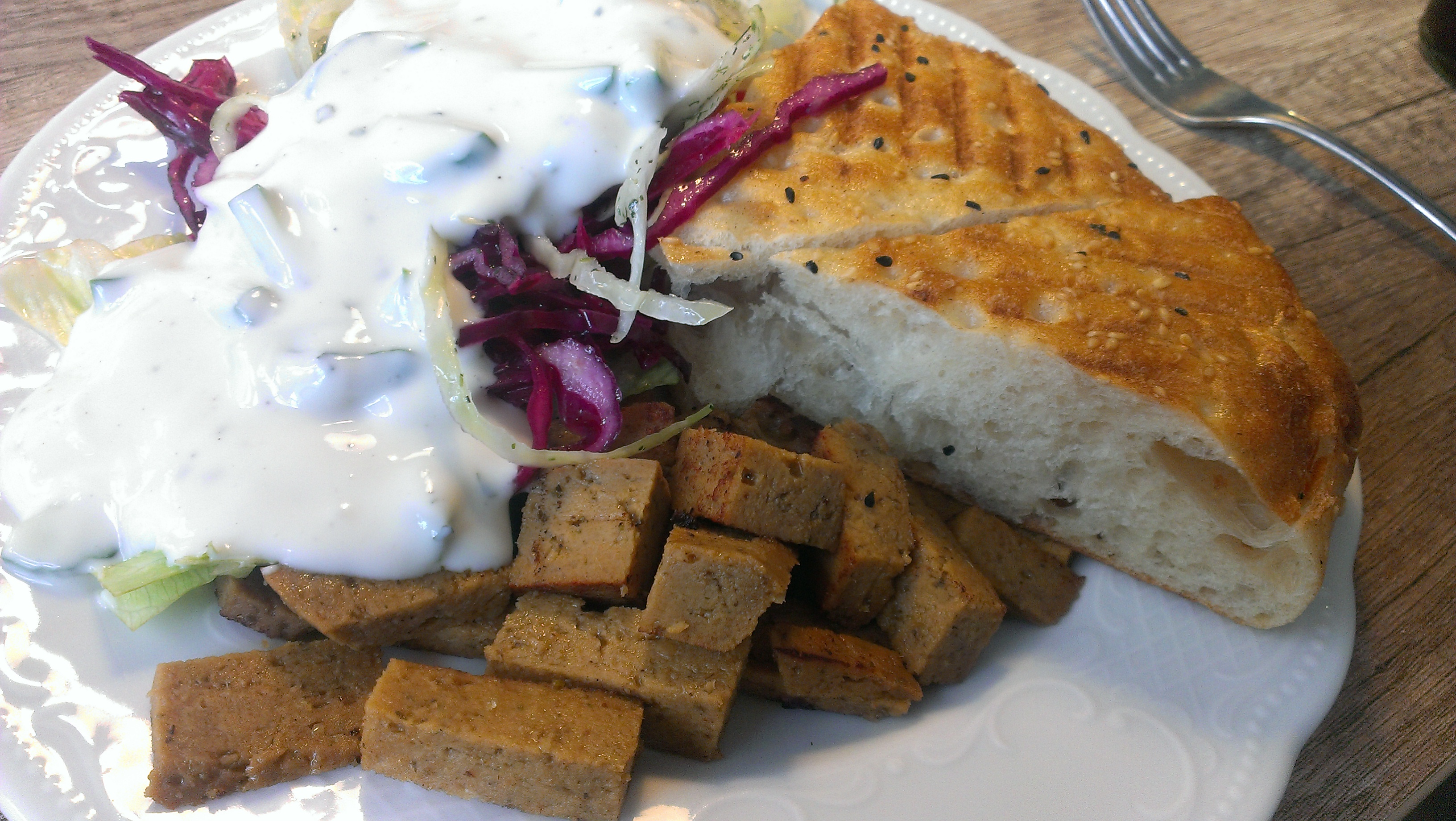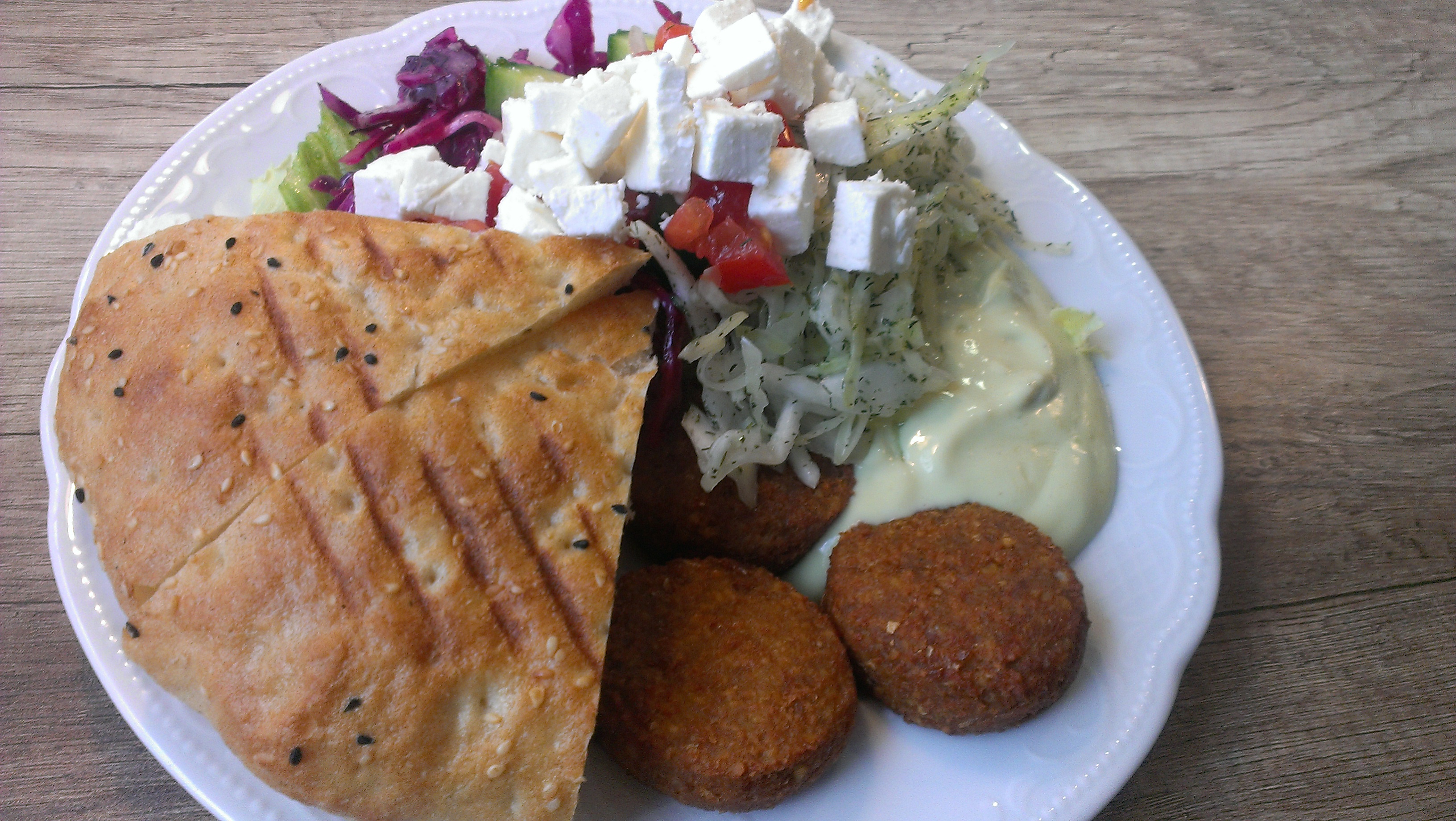 Falafelteller mit Feta, Dönerteller, Not Dog, Waffeln mit Sahne und Kirschen (in Lucy’s Café, Bochum)